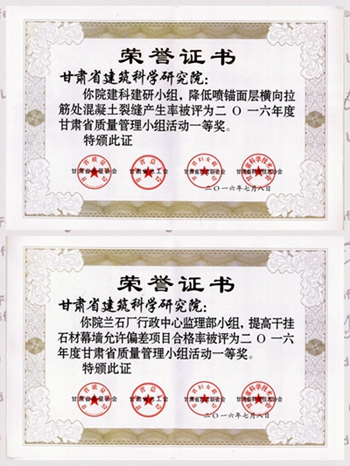 甘肅省建筑科學(xué)研究院在甘肅省第三十六次質(zhì)量管理小組年會(huì)暨成果發(fā)表會(huì)上再傳喜訊,科研院共申報(bào)八個(gè)小組成果,其中五項(xiàng)獲得省質(zhì)量管理小組一等獎(jiǎng),分別為《提高重型動(dòng)力觸探試驗(yàn)準(zhǔn)確率》、《提高綠色建筑評(píng)價(jià)條文達(dá)標(biāo)率》、《提高干掛石材幕墻允許偏差項(xiàng)目合格率》、《降低噴錨面層橫向拉筋處混凝土裂縫產(chǎn)生率》、《提高錨桿靜壓樁施工質(zhì)量》;另外三項(xiàng)獲得省質(zhì)量管理小組二等獎(jiǎng),分別是《提高鋁合金窗框安裝一次合格率》、《教學(xué)樓墻體加固內(nèi)墻抹灰面質(zhì)量控制》和《降低工程設(shè)計(jì)建筑專業(yè)與相關(guān)專業(yè)銜接環(huán)節(jié)差錯(cuò)率》。