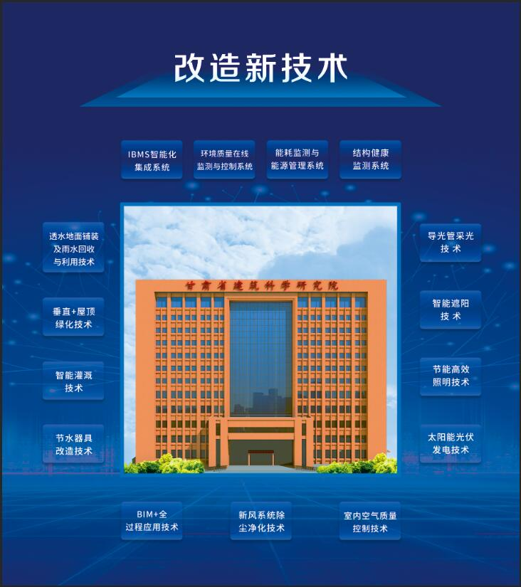 近幾年,建科院致力于綠色建筑研究,對既有建筑物的綠色智慧改造進行了深入探討。從“建研大廈”購置初期,就針對該項目組建了規(guī)劃、設(shè)計、科研團隊,對甘肅省綠色建筑適用技術(shù)進行了分析和篩選,全程跟進項目進展。建研大廈綠色智慧改造,具體分為圍護結(jié)構(gòu)節(jié)能改造技術(shù)、室內(nèi)外環(huán)境優(yōu)化技術(shù)、新能源利用與智能系統(tǒng)應(yīng)用技術(shù)四大方面,關(guān)鍵技術(shù)可以概況為建筑智能化管理平臺、環(huán)境監(jiān)測管理平臺、能耗監(jiān)測管理平臺、結(jié)構(gòu)健康監(jiān)測平臺的四大管理平臺系統(tǒng)與BIM+設(shè)計改造運維管理技術(shù)、多功能智慧展廳技術(shù)、新風(fēng)系統(tǒng)除塵凈化及室內(nèi)空氣質(zhì)量控制技術(shù)、導(dǎo)光管采光技術(shù)、智能遮陽技術(shù)、屋頂綠化技術(shù)、雨水利用技術(shù)、智能灌溉技術(shù)等20余項建筑新技術(shù)。