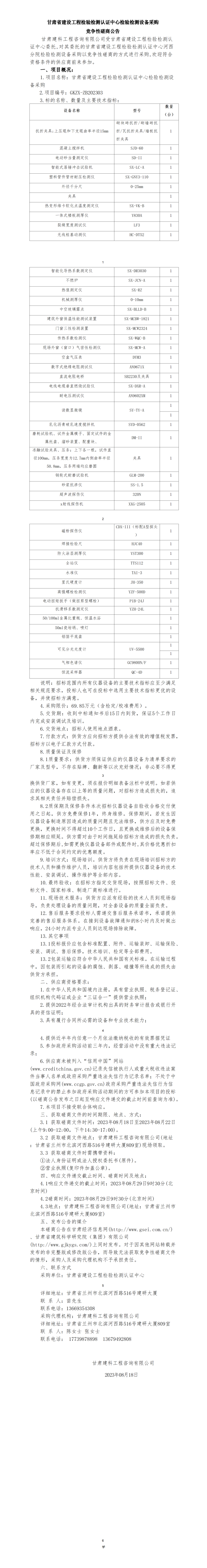 甘肅省建設(shè)工程檢驗檢測認證中心檢驗檢測設(shè)備采購競爭性磋商公告
