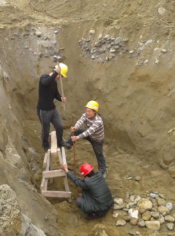 圖1 以往施工單位人工釬探 圖2 我院改進(jìn)后人工釬探