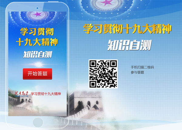 網(wǎng)友可登錄共產(chǎn)黨員網(wǎng)首頁,進(jìn)入“學(xué)習(xí)貫徹十九大精神知識自測”專區(qū)進(jìn)行答題,或者通過手機(jī)掃描二維碼參與答題。