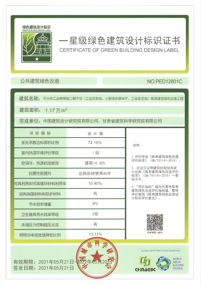 10月,中國城市科學研究會通過線上的方式召開全國第七批綠色建筑標識評審會,由建科院(集團)公司綠建中心進行既有建筑綠色改造設計(一星)評價咨詢的天水市工業(yè)博物館二期子項順利通過了綠建評審。2020年8月,中國建筑設計研究院有限公司委托建科院(集團)公司對該項目進行既有建筑綠色改造設計(一星)評價咨詢。建科院(集團)公司綠色建筑與產(chǎn)業(yè)研發(fā)中心為該項目的綠建改造和綠色建筑標識申報提供了技術支撐。本項目是建科院(集團)公司綠建中心繼《蘭州市建研大廈綠色智慧改造項目》之后的又一個甘肅省既有建筑綠色改造項目評星工作,此項工作的順利完成在響應國家政策號召的同時也體現(xiàn)了建科院(集團)公司在既有建筑物綠色改造方面的雄厚實力。