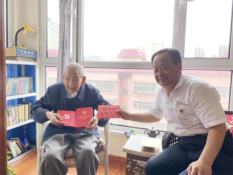 紀(jì)委書(shū)記、工會(huì)主席閻新明及機(jī)關(guān)部室相關(guān)負(fù)責(zé)人走訪慰問(wèn)了黨齡50年的100歲離休黨員薛篤昶老人。由于百歲老人薛老與中國(guó)共產(chǎn)黨同壽,“雙百”可謂錦上添花,好事成雙。當(dāng)閻新明將“光榮在黨50周年”紀(jì)念章頒發(fā)給薛老時(shí),老人滿含熱淚表達(dá)了對(duì)中國(guó)共產(chǎn)黨的感恩和對(duì)公司各位領(lǐng)導(dǎo)的真誠(chéng)感謝。薛老激動(dòng)地說(shuō)到:“與黨同齡,是我一生之幸!”