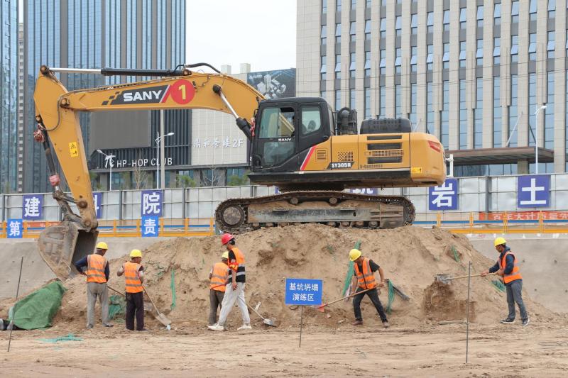 上午10時(shí)整,隨著王春景一聲令下,各作業(yè)區(qū)、部室及演練人員迅速到達(dá)指定區(qū)域開始模擬基坑塌陷演練。其設(shè)置情景是:勞務(wù)作業(yè)人員在現(xiàn)場(chǎng)作業(yè)期間發(fā)生土方塌方,該班組安全員發(fā)現(xiàn)了該作業(yè)人員被掩埋,立即上前進(jìn)行施救,并快速將人員信息傳送至項(xiàng)目部應(yīng)急領(lǐng)導(dǎo)小組,報(bào)告塌方事故的時(shí)間、地點(diǎn)等信息。現(xiàn)場(chǎng)指揮根據(jù)事故情況宣布啟動(dòng)應(yīng)急預(yù)案,立即通知項(xiàng)目部醫(yī)療小組、安全小組帶上擔(dān)架、藥箱、警戒線立刻趕往現(xiàn)場(chǎng)準(zhǔn)備警戒施救工作,通知救護(hù)車輛進(jìn)場(chǎng)待命。