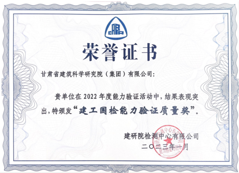 近日,甘肅建科院榮獲由中國建筑科學研究院建筑工程檢測中心頒發(fā)的“建工國檢能力驗證質(zhì)量獎”。