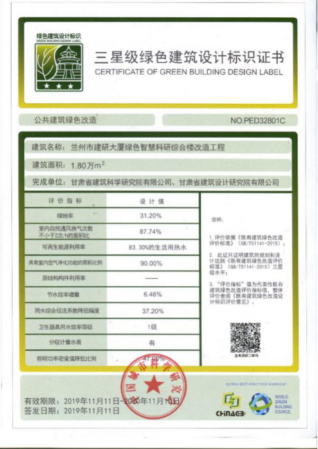 近日,甘肅省建筑科學(xué)研究院有限公司開(kāi)展的“建研大廈綠色智慧科研綜合樓改造工程”項(xiàng)目喜獲中國(guó)城市科學(xué)研究會(huì)頒發(fā)的國(guó)家三星級(jí)綠色建筑設(shè)計(jì)標(biāo)識(shí)證書。這是甘肅省首幢獲得國(guó)家綠色建筑設(shè)計(jì)三星標(biāo)識(shí)的既有建筑綠色改造工程項(xiàng)目,也是西北地區(qū)第一個(gè)獲得國(guó)家綠色建筑設(shè)計(jì)三星標(biāo)識(shí)的既有公共建筑綠色改造工程項(xiàng)目。