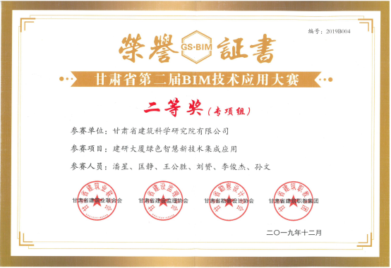 大會(huì)為省建科院頒發(fā)了甘肅省第二屆 BIM 技術(shù)應(yīng)用大賽專項(xiàng)組二等獎(jiǎng)榮譽(yù)證書。由甘肅省建筑業(yè)聯(lián)合會(huì)、甘肅省勘察設(shè)計(jì)協(xié)會(huì)、甘肅省建設(shè)監(jiān)理協(xié)會(huì)、甘肅省建筑職教集團(tuán)、甘肅建筑職業(yè)技術(shù)學(xué)院、甘肅益埃畢建筑科技有限公司共同舉辦的甘肅省第二屆 BIM 技術(shù)應(yīng)用大賽,旨在進(jìn)一步促進(jìn) BIM 技術(shù)在我省工程建設(shè)領(lǐng)域的普及應(yīng)用,鼓勵(lì)創(chuàng)新實(shí)踐,弘揚(yáng)創(chuàng)新文化,加速建筑類高校 BIM人才培養(yǎng)。在本次大賽中,省建科院“建研大廈綠色智慧新技術(shù)集成應(yīng)用”項(xiàng)目通過初審、終審答辯等環(huán)節(jié),獲得了專項(xiàng)組二等獎(jiǎng)。
