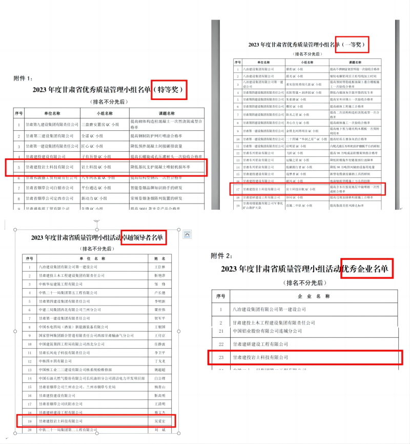 近日,2023年度“甘肅省質量管理小組活動成果獎”揭曉,建投巖土科技公司被評為“2023年度甘肅省質量管理小組活動優(yōu)秀企業(yè)”,2項QC活動成果取得優(yōu)異成績,其中《降低基坑支護混凝土噴射機損壞率》課題榮獲省級特等獎,《提高含水紅膠泥地層中旋噴樁一次性成樁合格率》課題榮獲省級一等獎?!皫r土科技QC小組”自成立來已連續(xù)三年榮獲QC活動成果省級特等獎、一等獎,兩位小組成員分獲“2023年度甘肅省質量管理小組活動卓越領導者”和“2023年度甘肅省質量管理小組活動優(yōu)秀推進者”榮譽。