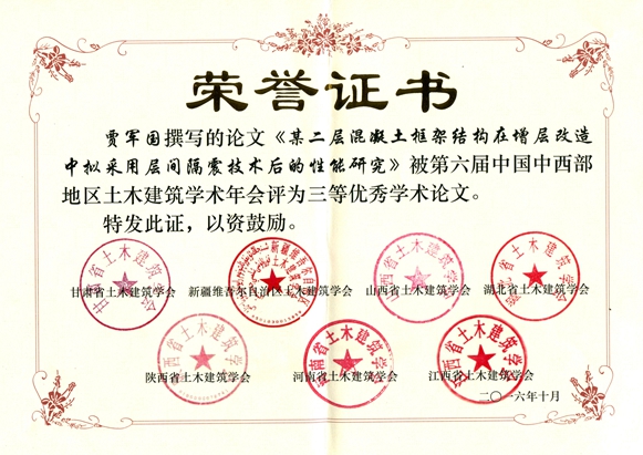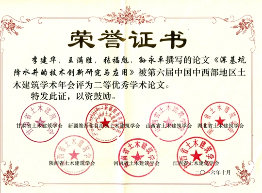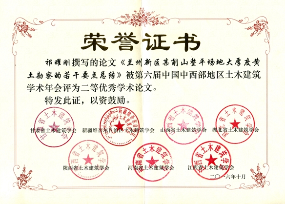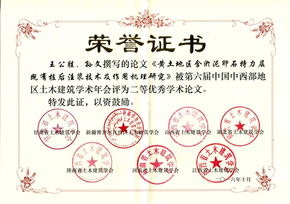 會(huì)議分三部分進(jìn)行:首先是秘書長(zhǎng)聯(lián)席會(huì),通報(bào)第六屆會(huì)議準(zhǔn)備情況,并探討中西部學(xué)會(huì)的發(fā)展情況;其次是開幕式及學(xué)術(shù)交流,共有王秀麗等9位教授或高級(jí)工程師做主題交流;最后頒發(fā)了西部土木工程防災(zāi)減災(zāi)青年人才工程獎(jiǎng)、中國(guó)中西部地區(qū)土木建筑杰出工程師獎(jiǎng)、優(yōu)秀論文獎(jiǎng)三類獎(jiǎng)項(xiàng)。在頒獎(jiǎng)儀式上,我院四篇論文分獲第六屆中國(guó)中西部地區(qū)土木建筑學(xué)術(shù)年會(huì)二、三等獎(jiǎng)。其中二等獎(jiǎng)3項(xiàng),分別是:王公勝、孫文同志撰寫的《黃土地區(qū)含淤泥卵石持力層既有樁后注漿技術(shù)及作用機(jī)理研究》;李建華、王滿勝、張福彪、孫永卓同志撰寫的《深基坑降水井的技術(shù)創(chuàng)新研究與應(yīng)用》;祁曜剛同志撰寫的《蘭州新區(qū)某削山整平場(chǎng)地大厚度黃土勘察的若干要點(diǎn)總結(jié)》;三等獎(jiǎng)1項(xiàng),即賈軍國(guó)同志撰寫的《某二層混凝土框架結(jié)構(gòu)在增層改造中擬采用層間隔震技術(shù)后的性能研究》。