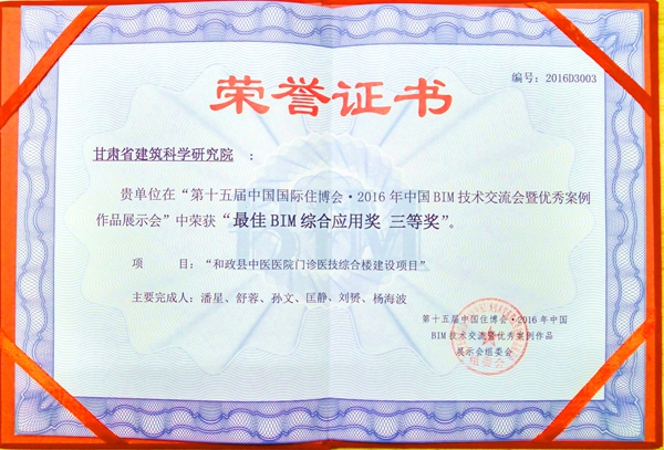 甘肅省建筑科學(xué)研究院參加了本次第十五屆中國(guó)住博會(huì)·2016年中國(guó)BIM技術(shù)交流會(huì)大賽。本次大賽主要分為兩個(gè)階段:第一階段,項(xiàng)目模型網(wǎng)絡(luò)投票,本階段占最終分值的30%;第二階段,項(xiàng)目模型實(shí)際檢測(cè),評(píng)委組專(zhuān)家通過(guò)對(duì)實(shí)際模型檢測(cè)及評(píng)估得出相應(yīng)的分值,本階段占最終分值的70%。甘肅省建筑科學(xué)研究院科技研發(fā)中心BIM小組申報(bào)的《和政縣中醫(yī)醫(yī)院門(mén)診醫(yī)技綜合樓建設(shè)項(xiàng)目》獲得了此次大賽綜合應(yīng)用組的最佳BIM綜合應(yīng)用三等獎(jiǎng),這是第十五屆中國(guó)住博會(huì)·2016年中國(guó)BIM技術(shù)交流會(huì)甘肅省獲得的唯一一個(gè)獎(jiǎng)項(xiàng),對(duì)甘肅省建筑科學(xué)研究院在BIM領(lǐng)域的發(fā)展意義重大、機(jī)會(huì)彌足珍貴。