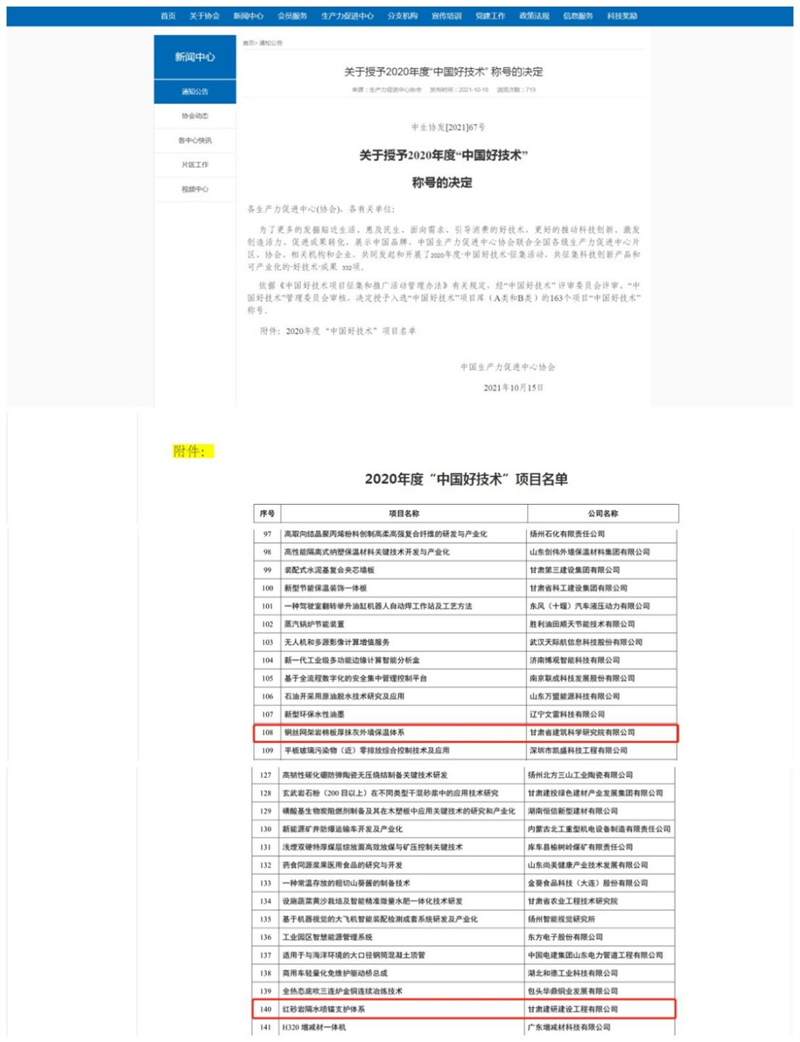 10月15日,中國(guó)生產(chǎn)力促進(jìn)中心協(xié)會(huì)發(fā)布《關(guān)于授予2020年度“中國(guó)好技術(shù)”稱號(hào)的決定》(中生協(xié)發(fā)[2021]67號(hào)),甘肅省建筑科學(xué)研究院(集團(tuán))有限公司申報(bào)的“鋼絲網(wǎng)架巖棉板厚抹灰外墻保溫體系”技術(shù)和建研建設(shè)公司申報(bào)的“紅砂巖隔水噴錨支護(hù)體系”技術(shù)成功入選2020年度“中國(guó)好技術(shù)”項(xiàng)目庫(B類),并獲得“中國(guó)好技術(shù)”稱號(hào)。這是建科院(集團(tuán))公司首次獲得這一殊榮。