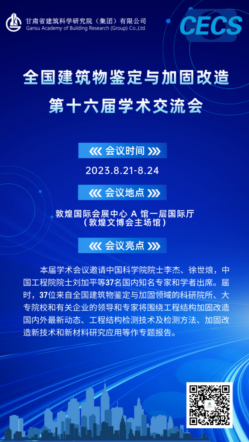 全國建筑物鑒定與加固改造第十六屆學(xué)術(shù)交流會計劃于2023年8月21日-24日在甘肅敦煌舉行。會議由中國工程建設(shè)標(biāo)準(zhǔn)化協(xié)會建筑物鑒定與加固專業(yè)委員會主辦,甘肅省建筑科學(xué)研究院(集團(tuán))有限公司承辦。