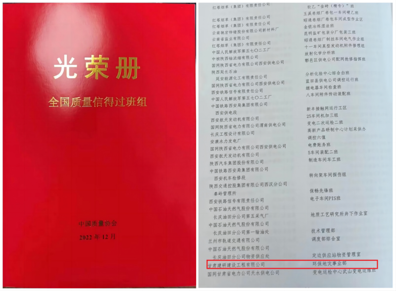 近日,在中國質(zhì)量協(xié)會2022年“全國質(zhì)量信得過班組”建設推進活動中,甘肅建研建設工程有限公司環(huán)保地災事業(yè)部經(jīng)過層層選拔,繼獲得“甘肅省質(zhì)量信得過班組”榮譽后,又榮獲“2022年全國質(zhì)量信得過班組”。