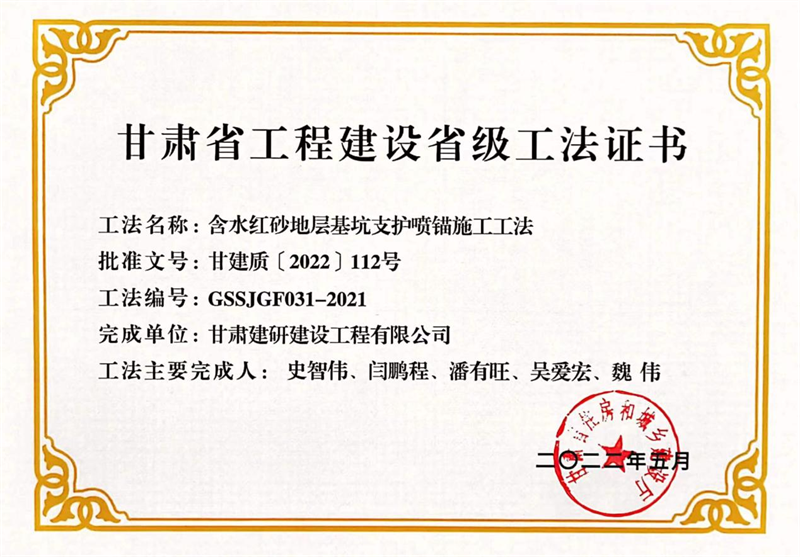 近日,省住房和城鄉(xiāng)建設(shè)廳發(fā)布甘肅省2021年度工法公告,建科院建研建設(shè)公司申報的含水紅砂巖地層基坑支護噴錨施工工法評定為省級工法。
