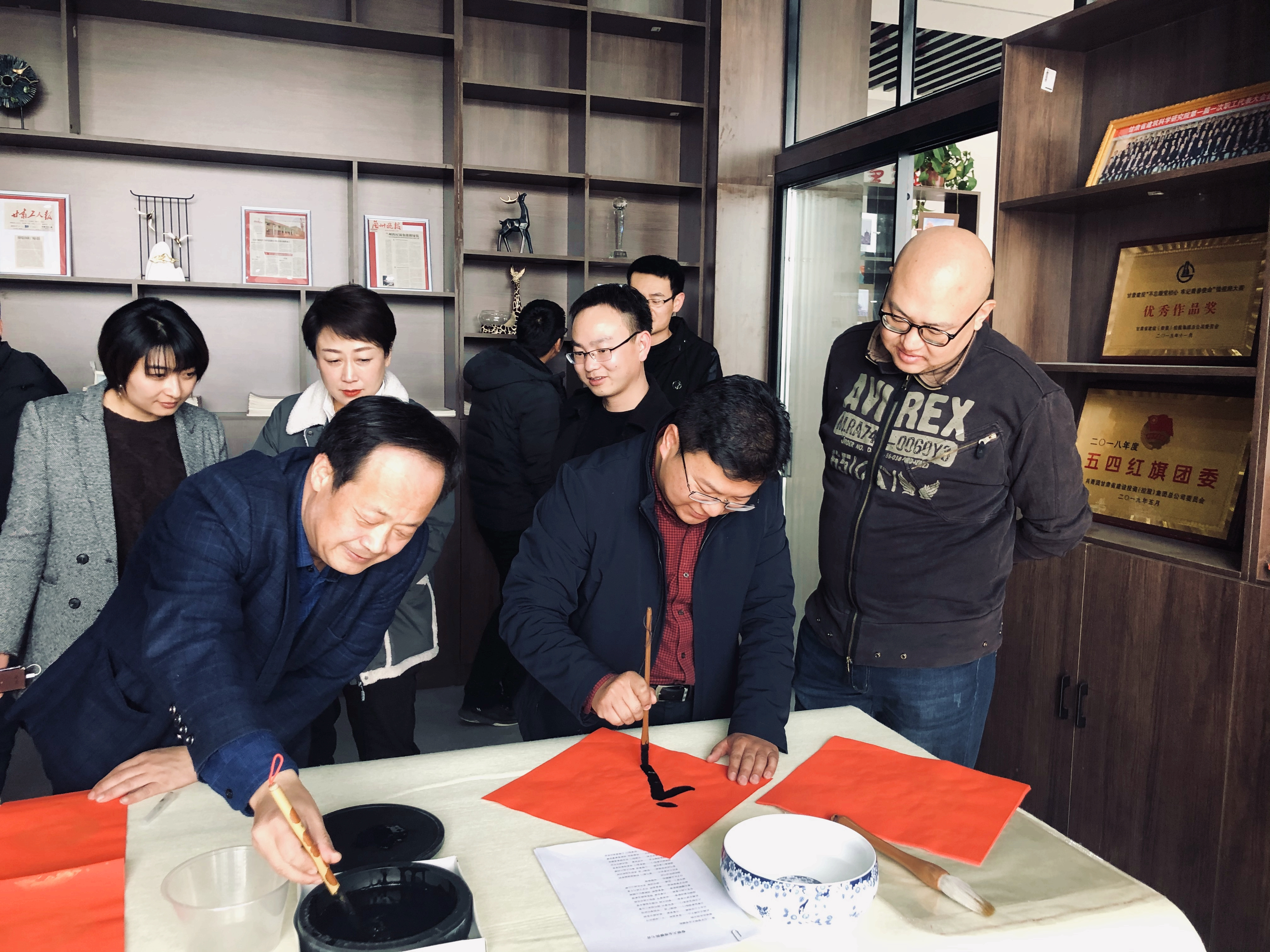春聯(lián)書(shū)寫(xiě)現(xiàn)場(chǎng)氣氛歡快熱烈,濃濃年味撲面而來(lái)。公司具有書(shū)法特長(zhǎng)的領(lǐng)導(dǎo)和職工在公司十二樓活動(dòng)室樓飽蘸激情,揮毫潑墨。濃濃的墨香,不僅傳遞出傳統(tǒng)文化的魅力,也裝滿了節(jié)日的喜慶。一幅幅傳遞吉祥喜慶、表達(dá)美好祝福、歌頌美好生活的春聯(lián),既有揮別鼠年、喜迎牛年的美好愿景,又有祈祝平安吉祥、事順年豐的真摯祝愿,字里行間、紅色韻味中表達(dá)著對(duì)全體干部職工的良好祝愿和對(duì)未來(lái)的美好展望。聞?dòng)嵍鴣?lái)的職工一邊欣賞寫(xiě)好的春聯(lián),一邊根據(jù)個(gè)人愛(ài)好挑選稱心的作品,一些職工還自選對(duì)聯(lián)內(nèi)容,請(qǐng)他們書(shū)寫(xiě)。在兩個(gè)多小時(shí)的活動(dòng)中,上百幅對(duì)聯(lián)和福字送到了職工手中。